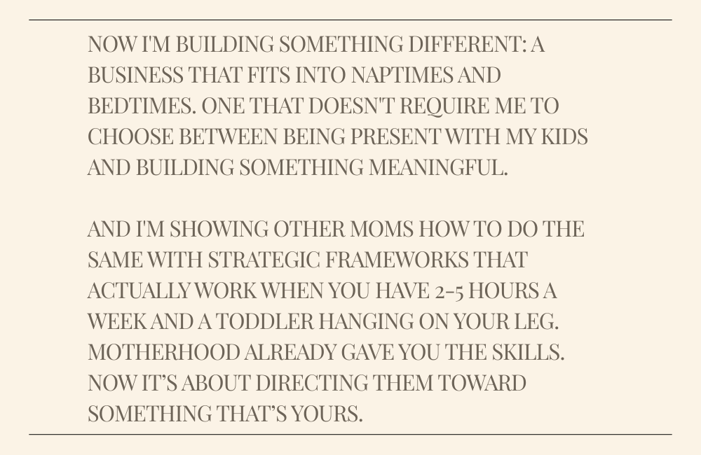 Now, I help moms and women build steady, sustainable income alongside full lives, without hustle culture, guilt, or pretending we have unlimited time.